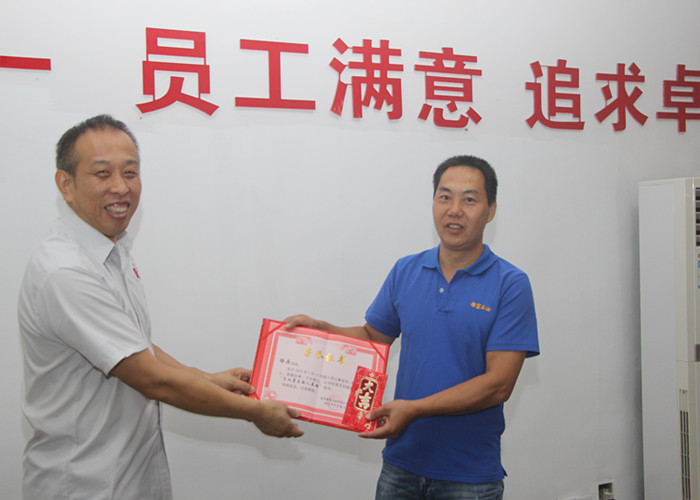 公司副總經理王飛躍(左)給徐兵頒發榮譽證書和獎金