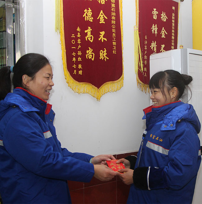 12月26日,公司董事長助理張臘枚代表公司將200元獎金發給銀富站加油員陳燕。12月16日下午3點多鐘,陳燕在加油現場拾到錢包一個,當即交到前臺負責人手里,經現場清點錢包里有現金5300元,還有一部老年人手機。前臺根據手機里最近聯系的電話很快聯系到了失主。失主與女兒在銀富站加油離開還只有幾公里。當家住華陰縣梅林湖的失主李清明趕到加油站領回失而復得的錢包時,連連感謝陳燕拾金不昧好精神。