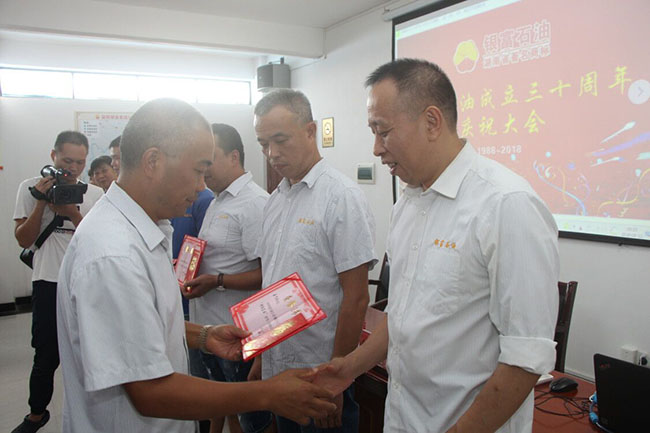 大會(huì)首先表彰了功勛員工、百日勞動(dòng)競(jìng)賽十大標(biāo)兵及先進(jìn)集體。被表彰的先進(jìn)代表作了精彩發(fā)言,功勛員工黃恩輝與大家分享了“選擇銀富愛銀富”、十大標(biāo)兵沈鋒與大家分享了“四會(huì)幫我當(dāng)上標(biāo)兵”、長(zhǎng)春站站長(zhǎng)曹丹與大家分享了“集體作戰(zhàn)贏得先進(jìn)集體”的成功經(jīng)驗(yàn)。最后公司董事長(zhǎng)郭立新作了“追夢(mèng)三十年 再創(chuàng)新時(shí)代”的講話。時(shí)光飛逝,三十年的歲月洗禮,三十年的堅(jiān)守,三十年的奮斗,三十年的追夢(mèng),追夢(mèng)的艱辛,圓夢(mèng)的喜悅,全都融入了董事長(zhǎng)郭立新“追夢(mèng)三十年,再創(chuàng)新時(shí)代”的講話中。董事長(zhǎng)郭立新說:“銀富石油用30年的時(shí)間,從一個(gè)油股子做到現(xiàn)在本地區(qū)同行業(yè)民營(yíng)企業(yè)之首,現(xiàn)在我們擁有益陽(yáng)銀富石油有限公司等六家全資子公司及控股公司;擁有加油加氣站、水上加油站、液化氣站12個(gè),員工近200人。”