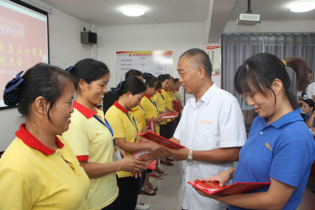 董事長(zhǎng)郭立新給公司功勛員工頒發(fā)榮譽(yù)證書與獎(jiǎng)金