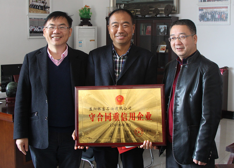 本公司訊,2017年11月27日,益陽(yáng)市工商局負(fù)責(zé)人一行代表省工商局,將2016年度“守合同重信用” 企業(yè)稱號(hào)獎(jiǎng)牌及榮譽(yù)證書頒發(fā)給公司董事長(zhǎng)、總經(jīng)理郭立新。銀富公司此次獲獎(jiǎng)是益陽(yáng)市成品油行業(yè)300多家企業(yè)唯一獲此殊榮的企業(yè),為益陽(yáng)爭(zhēng)得了榮譽(yù)。