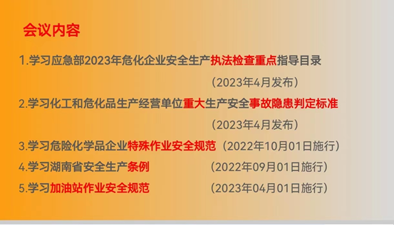 5月初就召開(kāi)安全生產(chǎn)專題會(huì)議,對(duì)安全生產(chǎn)月的工作安排進(jìn)行部署,對(duì)新實(shí)施的加油站作業(yè)安全規(guī)范、危險(xiǎn)化學(xué)品企業(yè)特殊作業(yè)安全規(guī)范、湖南省安全生產(chǎn)條例、化工和危化品生產(chǎn)經(jīng)營(yíng)單位重大生產(chǎn)安全事故隱患判定標(biāo)準(zhǔn)、危化企業(yè)安全生產(chǎn)執(zhí)法檢查重點(diǎn)指導(dǎo)目錄等進(jìn)行了培訓(xùn)學(xué)習(xí)。