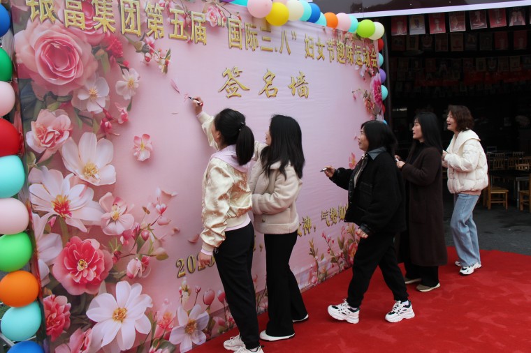 王輝平致辭后,第一個環節女神們走紅地毯開始,女神們依次神采奕奕,滿面春風的走在紅地毯上,以堅定自信的步伐走向簽名墻簽下自己的名字。讓女神們感到特別幸福快樂的是,簽完名后接著公司總經理在一旁一一給她們送上一支玫瑰花,送上節日最真摯的祝福。
