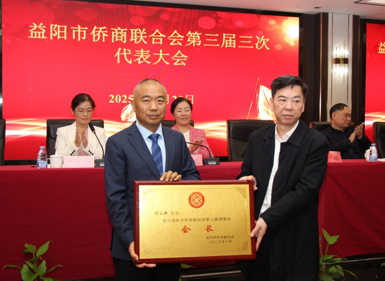 會議期間舉行了理事會選舉。憑借在僑商群體中的廣泛公信力與對家鄉發展的深厚責任感,公司董事長郭立新獲得全體代表無記名投票全票通過,當選為益陽市僑商聯合會第三屆理事會新任會長。市僑聯黨組書記、主席李超現場為其授牌。